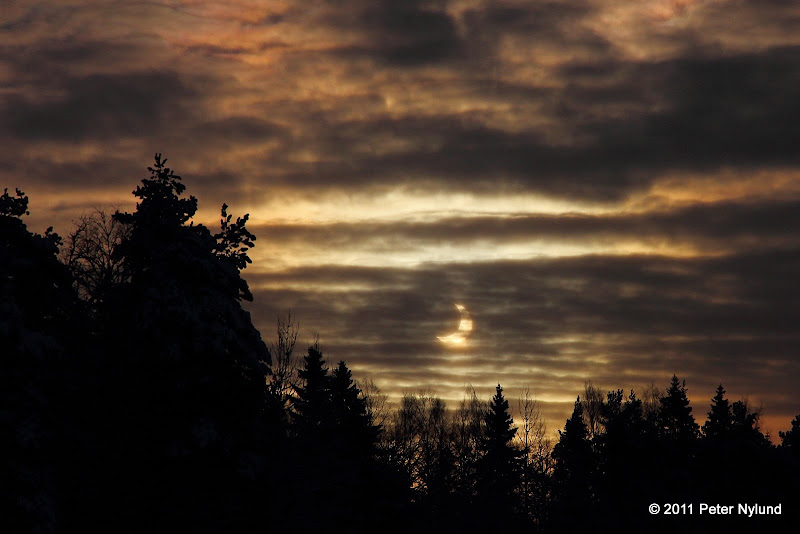 I didn't even care about the partial eclipse of the sun today, since the weather forecast promised a cloudy enough weather that it would not be visible. The clouds did however partly disappear during the morning, so I figured I should give it a try. I left work and grabbed my bike half an hour before the eclipse was to be at its maximum and went to find a suitable spot. Had I known it would be this visible, I would have taken some longer optics and sought out a better place to observe it. I did actually have my new camera (more about that later) with me and got some pictures with the normal range zoom. With my 400 mm lens I could have gotten some great shots, though.